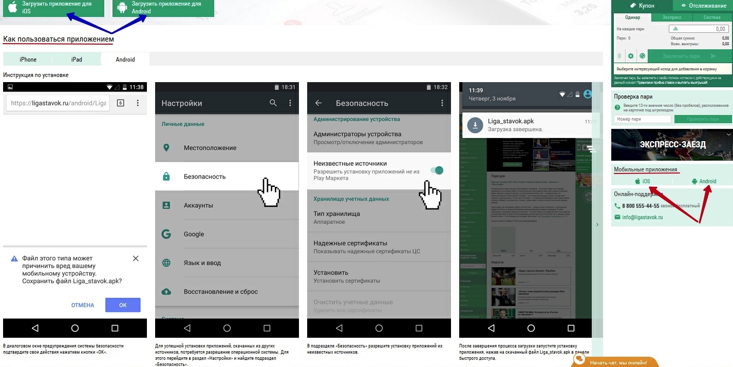 Есть приложения для iOS и Android. При нажатии на кнопки iOS или Android в правом нижнем углу появляются ссылки (показаны красными стрелками) на загрузку приложений.