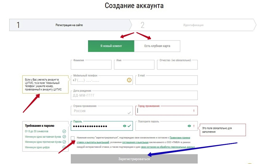 В форме регистрации введите сведения о себе, ознакомьтесь с правилами БК и согласитесь на обработку персональных данных. Если у вас есть клубная карта, введите номер паспорта и карты клиента. Снова щелкните на кнопку «Зарегистрироваться».