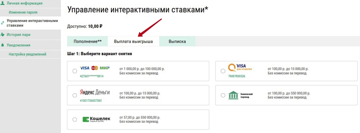 Способов вывода средств со счета меньше. Есть одна особенность – выплата выигрыша производится только через ту платежную систему, при помощи которой была совершена хотя бы одна интерактивная ставка. При этом часть способов для вывода средств, например, некоторые электронные кошельки активируются только после того, как с них был пополнен баланс. Немаловажный плюс – отсутствие каких-либо комиссий.