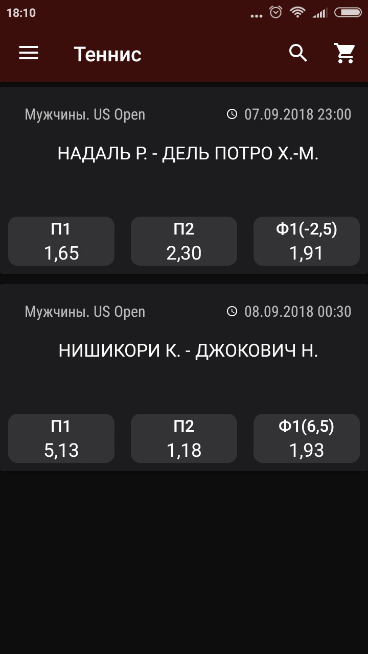 Порядок заключения пари рассмотрим на примере ставки на победу испанского теннисиста Рафаэля Надаля над аргентинцем Хуаном Мартином Дель Потро в полуфинале открытого первенства США.