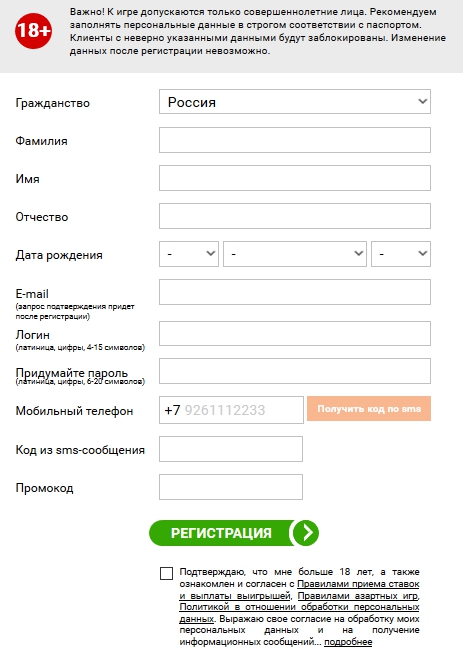 У букмекера. Нажмите зеленую кнопку «Регистрация» и заполните анкету с персональными данными. Запрос на подтверждение e-mail придет на указанную почту после регистрации, номер мобильного телефона проверяется через код по СМС.