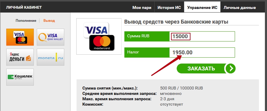 Для вывода средств меньше: банковские карточки (от 500 до 100 000 руб.), электронные кошельки – «Яндекс.Деньги» (500 – 15 000 руб.), Qiwi (500 – 15 000 руб.), ЦУПИС (500 – 595 000 руб.).